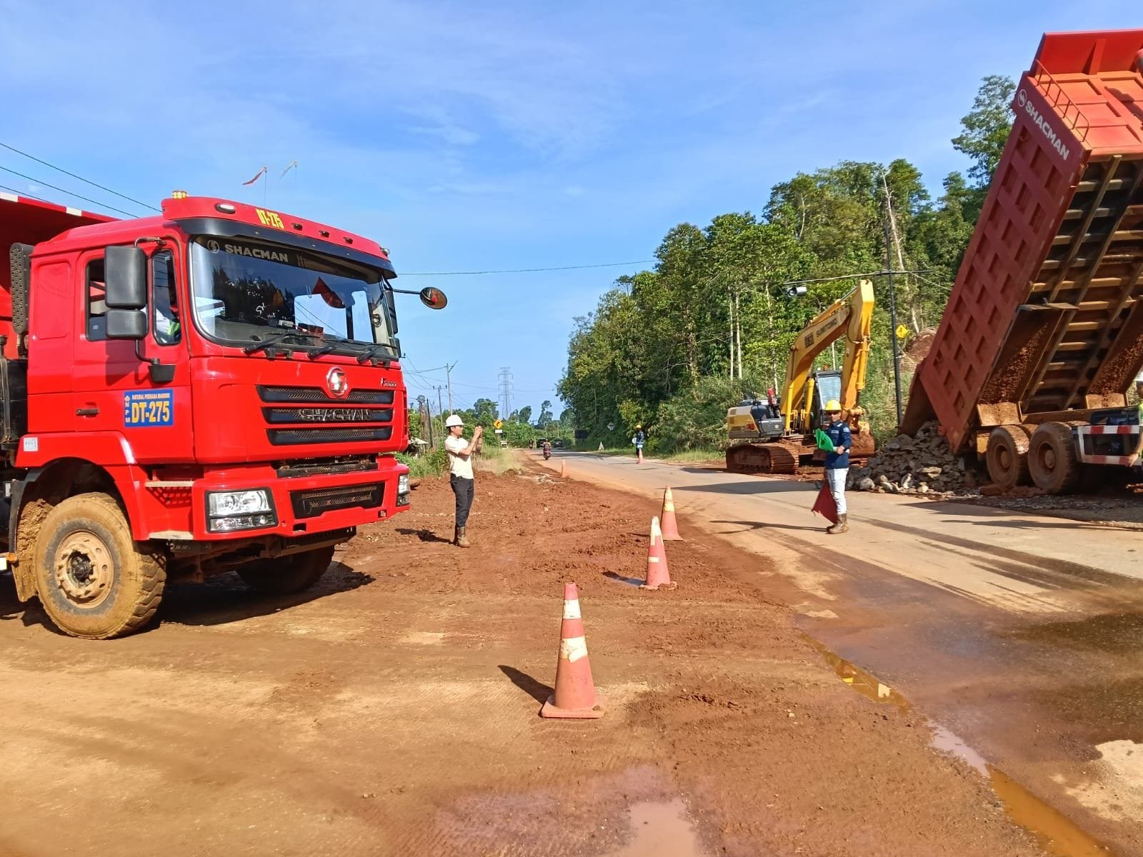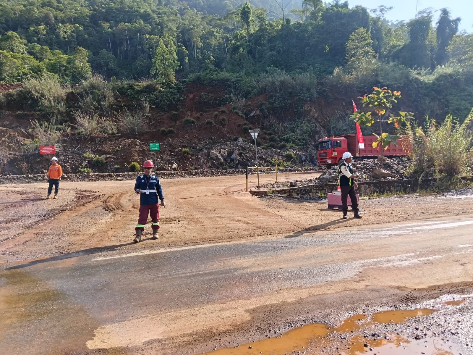 Pantauan media ini pukul 18.40, Senin (27 April 2026) Jalur Crossing yang digenangi air di badan jalan telah dibersihkan oleh pihak PT PUL dengan menurunkan beberapa alat berat termasuk water tank yang menyemprot tanah yang terbawa air.