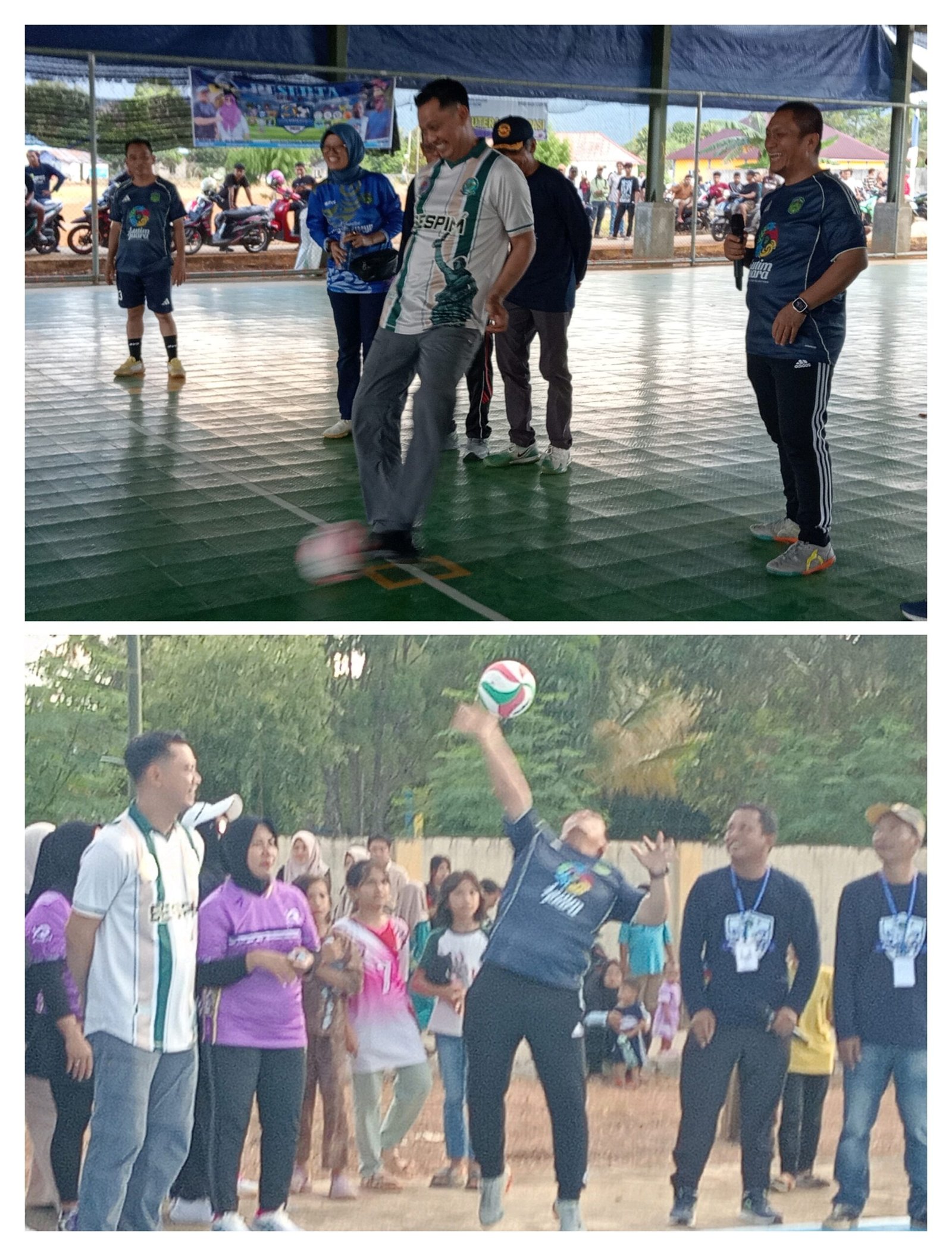 Kapolres Luwu Timur AKBP Ario Putranto TM melepaskan tendangan Pertama tanda dimulainya Pertandingan Mini Soccer dan Bupati Irwan Bachri Syam memukul Bola pertama Pertandingan Volly Putri di lapangan Desa Pasi Pasi.