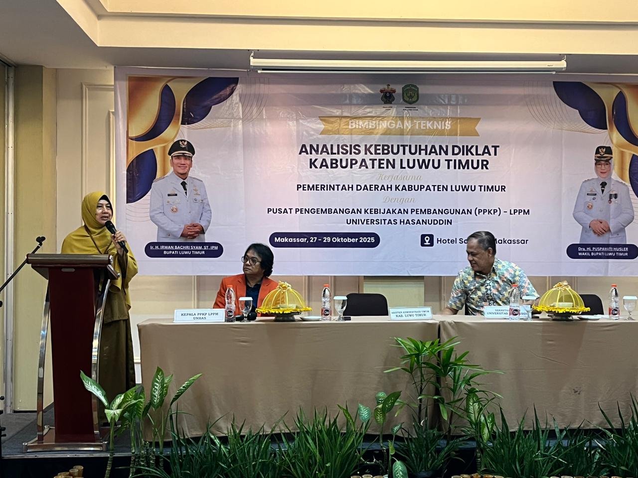 Luwu Timur, bilikf4kt@.id – Pemerintah Kabupaten Luwu Timur bekerjasama dengan Pusat Pengembangan Kebijakan Pembangunan Lembaga Penelitian (PPKP) dan Pengabdian kepada Masyarakat (LPPM) Universitas Hasanuddin (Unhas) menggelar Bimtek Analisis Kebutuhan Pendidikan dan Pelatihan (Diklat) Tahun 2025 yang berlangsung di Aula Hotel Santika, Makassar, Senin (27/10/2025).
