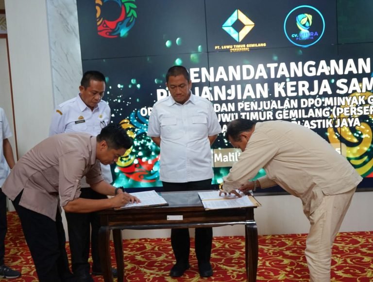 Penanda tanganan MOU Operasional dan penjualan Minyak Goreng antara PT MPJ dengan Direktur PT Lutim Gemilang Ikal AS disaksikan oleh Bupati Luwu Timur Ir. Irwan Bachri Syam di lobi kantor Bupati Luwu Timur, Rabu (10 September 2025) dan dihadiri oleh pejabat eselon Dua dan tiga Lingkup Pemda Luwu Timur.